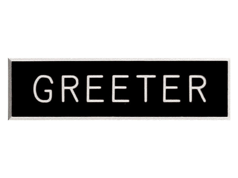This black and white badge features ?Greeter?, carefully engraved to create a simple and classic look. Each badge measures 5/8 x 2-1/4, and includes a carefully crafted pin back to ensure the badge wont slip off once pinned to clothing.